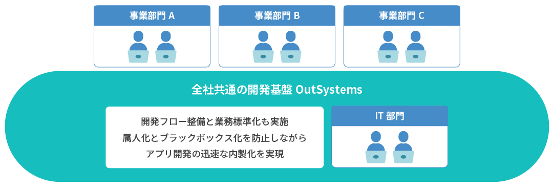 OutSystemsは高いプログラムの知識を必要とせず、現場の声を聞きながら柔軟で素早い開発、フィードバックを活かしたその後の機能改善が行えることに加えて、開発業務の共通プラットフォームとして開発の属人化を防ぎながら内製化を加速する効果をもたらします。