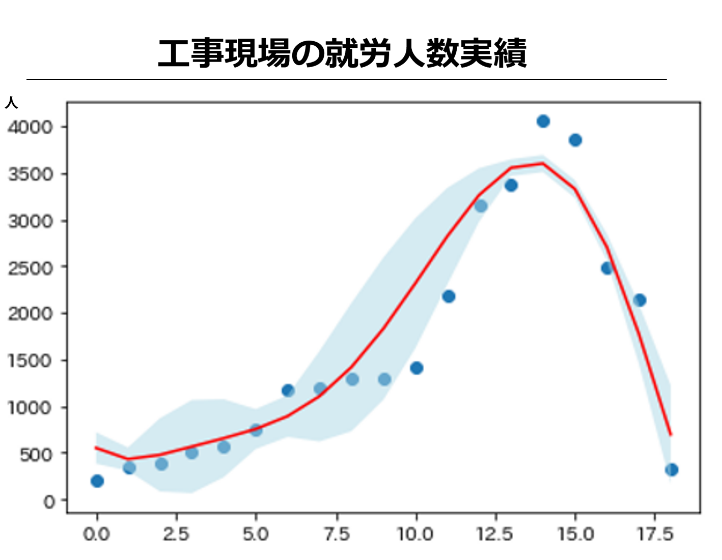 また、戸田建設では過去の自社工事における就労者数のデータを保有しており、このおかげでどのような工事に対して何人程度作業員が必要なのかがわかりました。そこで、当社では東京都が保有する標識設置届の情報と戸田建設者の工事実績データを組み合わせることで、東京都で行われる大規模工事の就労者数や推移を予測する機械学習モデルを構築しました。
