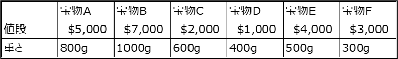 ”探検家はこのナップサックに入れる宝物の価値をできるだけ高くしたいのですが、どの荷物を選べば最も効率的に宝物を持って帰ることができるでしょうか。”