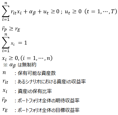 上記を勘案して最適なポートフォリオを選択するために数理計画モデル(=ポートフォリオ最適化モデル)を用いる。