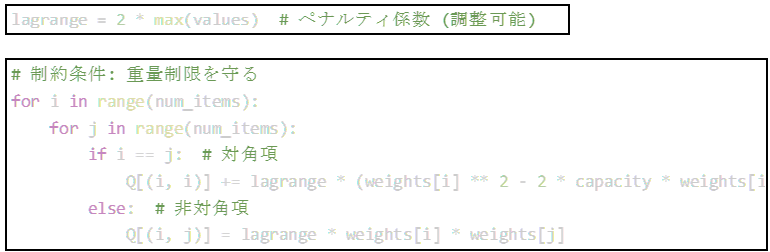 式全体としてはエネルギー関数が小さくなることを期待しているため、ペナルティは制約条件に違反するとエネルギー関数を大きくするようになっている。