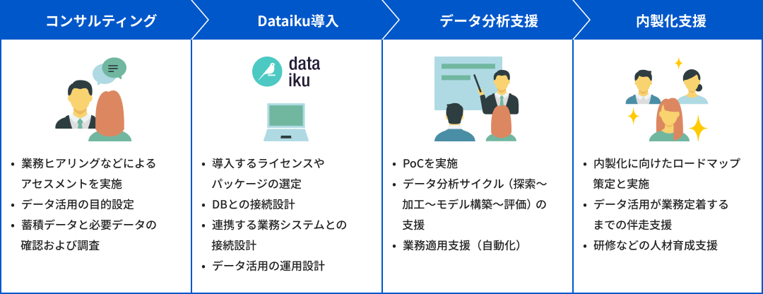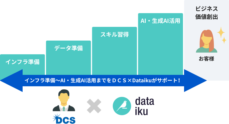 DCSはシステム構築とデータ分析の豊富な経験を活かして、Dataikuのサービス導入からAI活用まで一貫したサポートを提供し、ビジネス価値最大化に専念できる環境を整えます。